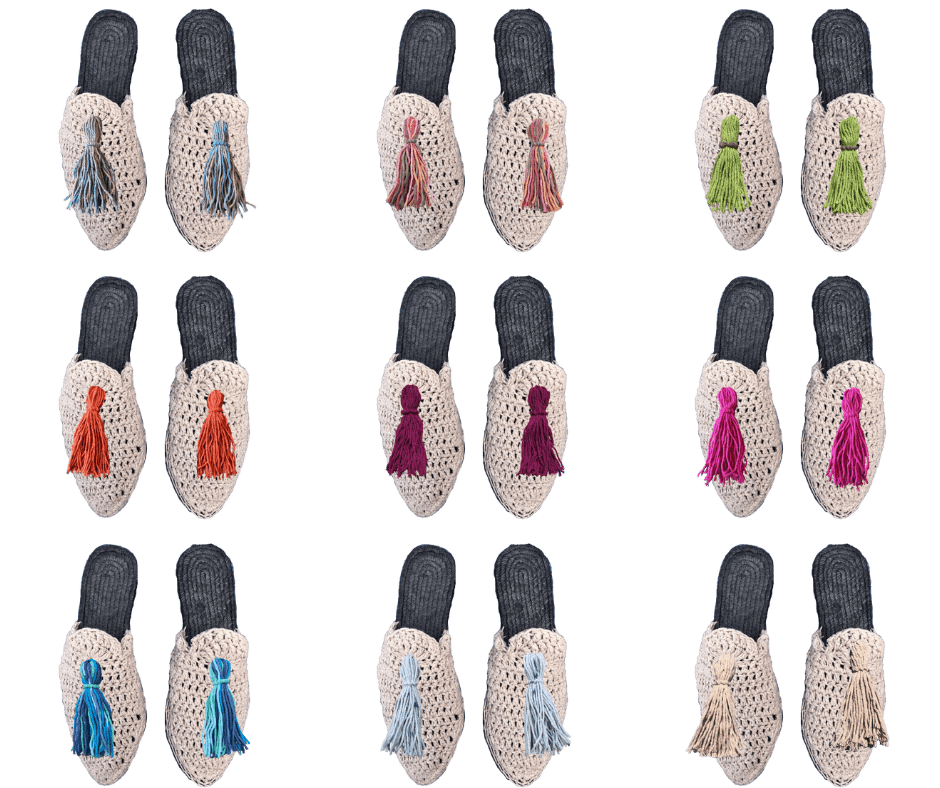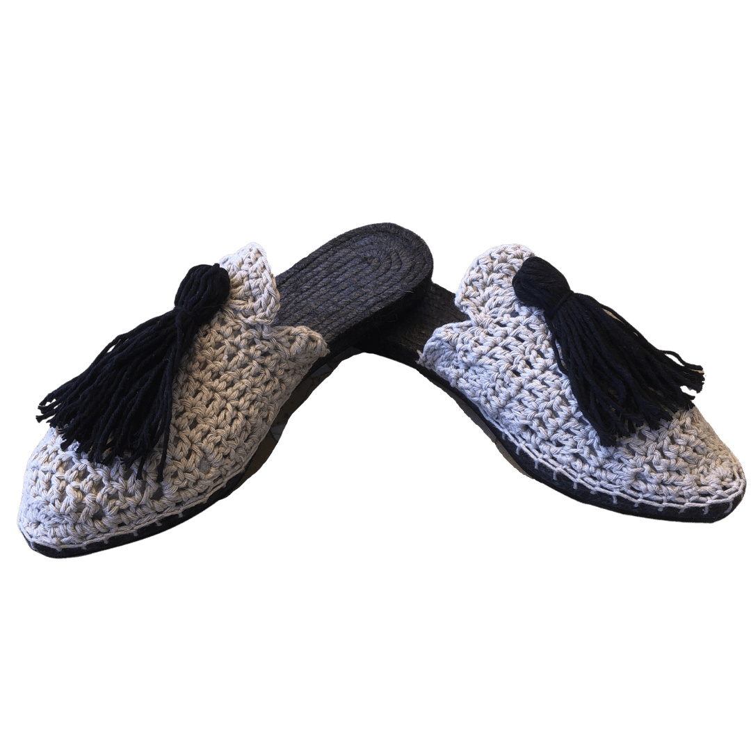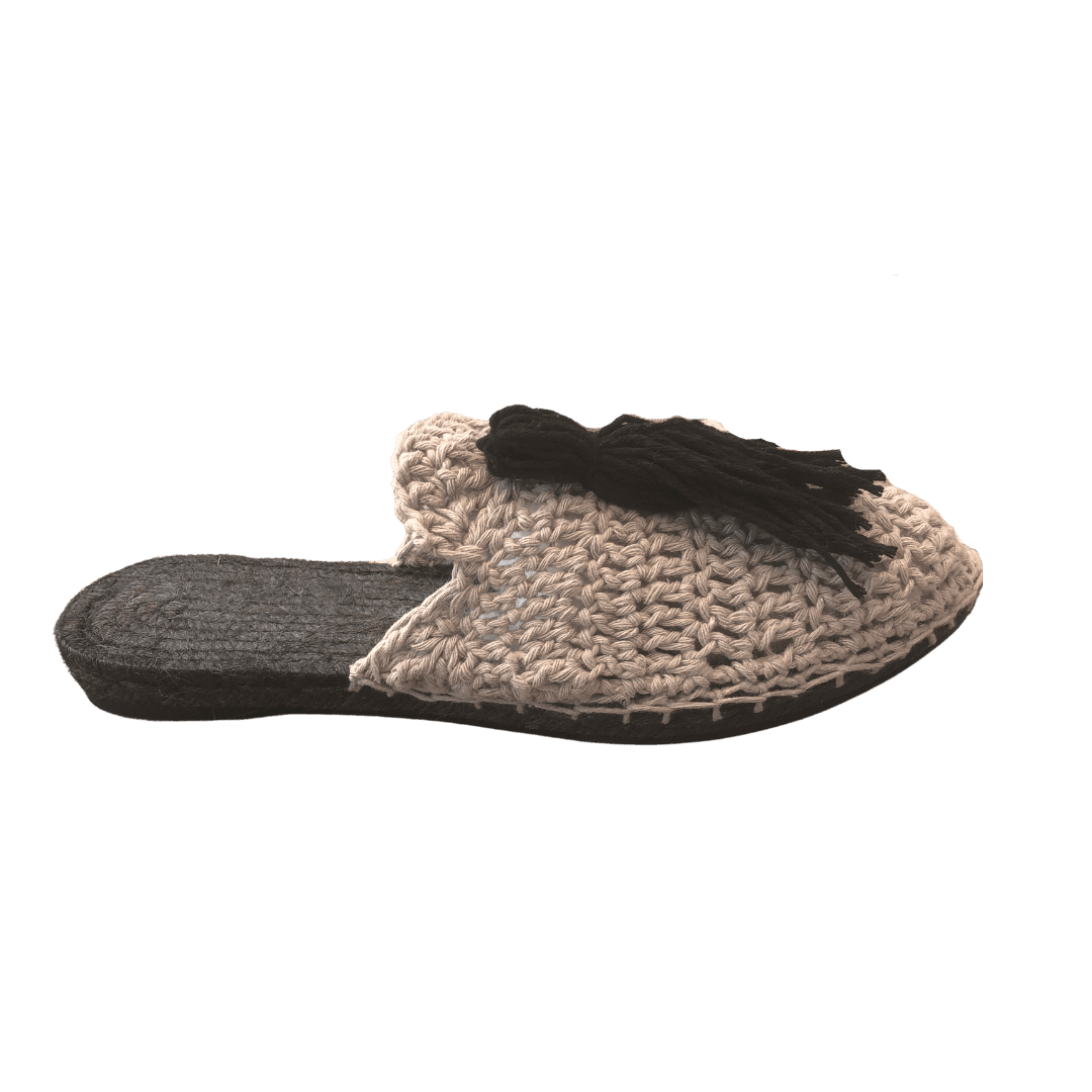 Este mule está hecho con una suela de alpargata en pico, elaborada en España y teñida a mano de color negro.