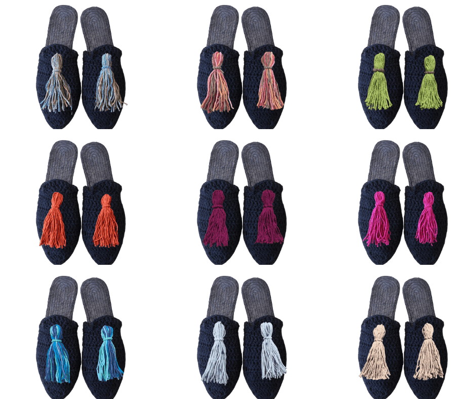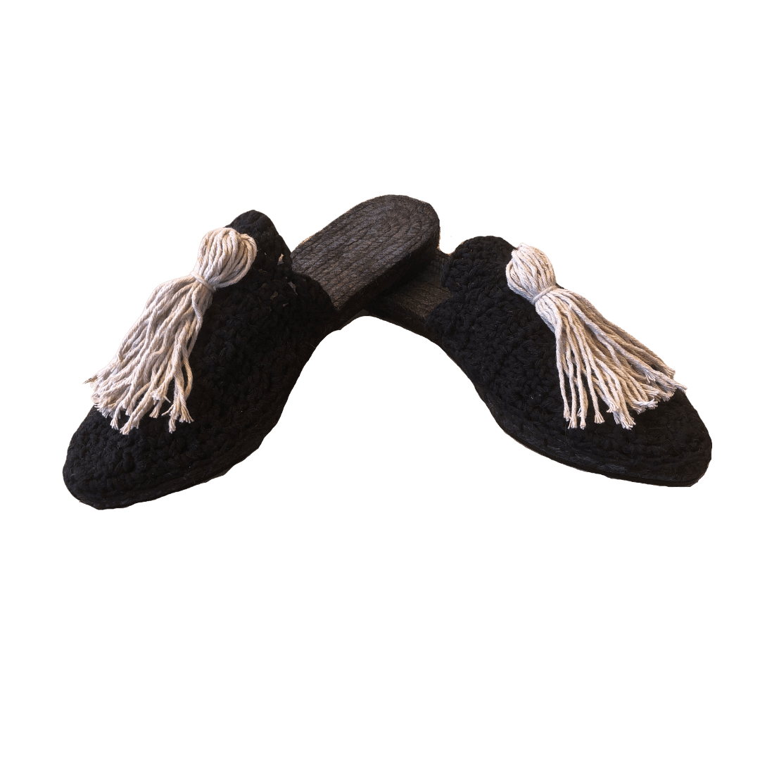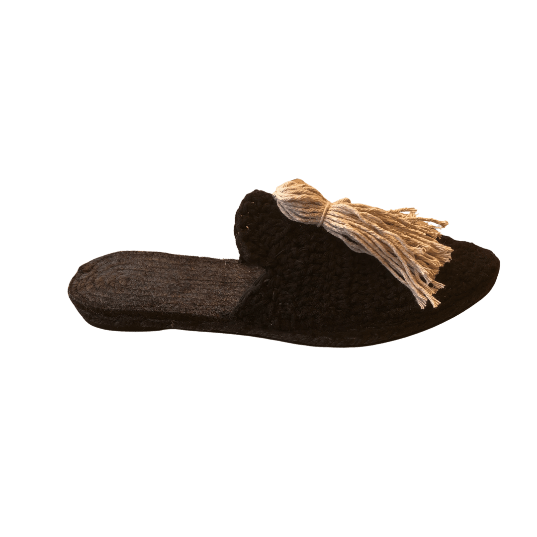 Este mule está hecho con una suela de alpargata en pico, elaborada en España y teñida a mano de color negro.