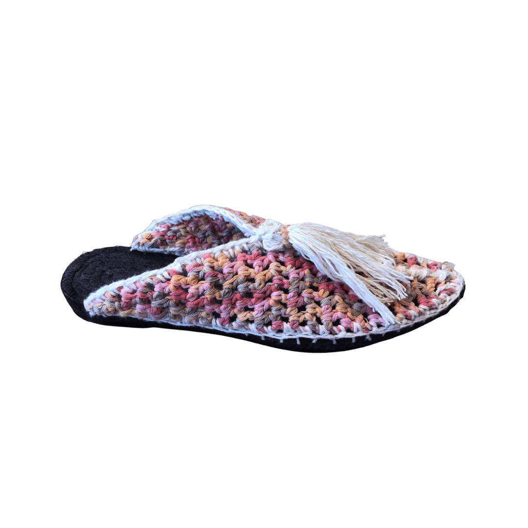 Esta pantufla está hecha con una suela de alpargata en pico, elaborada en España y teñida a mano de color negro.